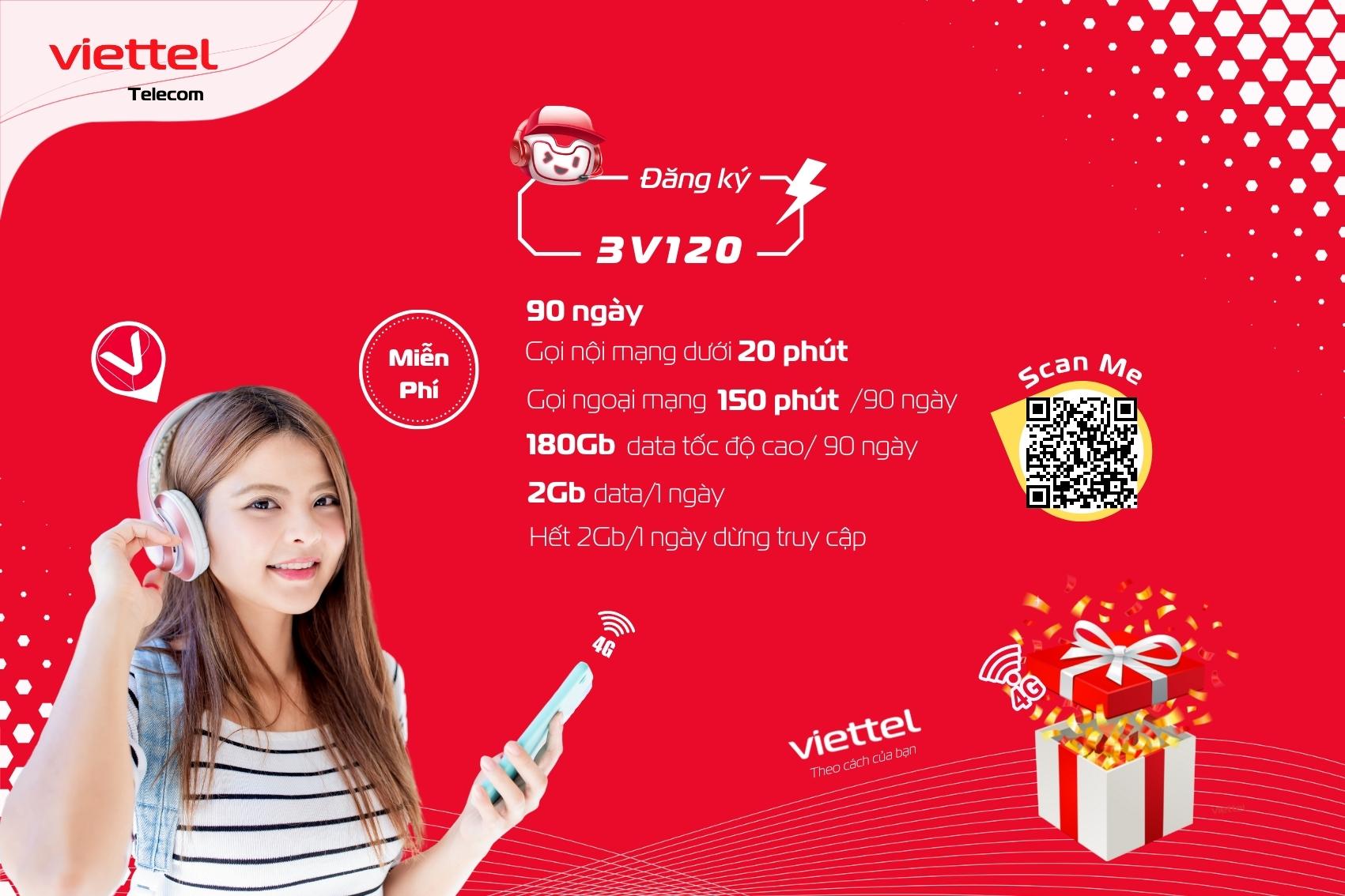 Đăng ký 3V120 Viettel chỉ với mức giá là 360.000đ cho 90 ngày sử dụng. Bạn được miễn phí tất cả các cuộc gọi nội mạng Viettel có thời lượng dưới 20 phút/ 1 cuộc. Miễn phí mỗi tháng 50 phút gọi ngoại mạng Viettel 1 tháng trong 3 tháng. Miễn phí tới 180Gb data 4G tốc độ cao truy cập mạng internet trên điện thoại di động ( 2Gb/ 1 ngày). Đây là mức ưu đãi vô cùng lớn mà nhà mạng dành tặng thuê bao di động Viettel của bạn đăng ký sử dụng.